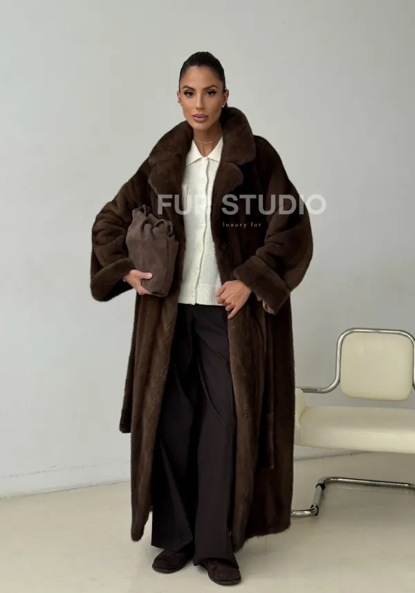 Мех данной шубы аукционная норка , цвет коричневый. Предлагается в размерах от 42 до 50. Длина модели 125-130 см, что выгодно подчеркивает фигуру девушек. Эта модель идеально подойдет для девушек и женщин, предпочитающих роскошные натуральные меха.