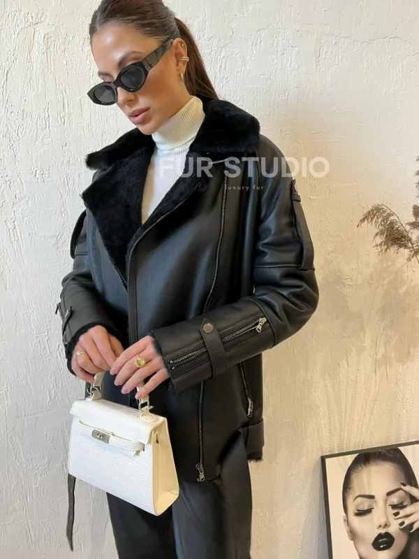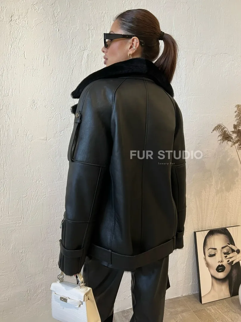 Необычный пояс по окантовке дубленки смотрится оригинально. Модель подойдет к базовому гардеробу, сочетается с джинсами и леггинсами. Если добавить к lookу грубые ботинки и кожаный рюкзак, то вы будете выглядеть, как с обложки. Купить дубленку авиатор в черном цвете из натуральной овчины могут дамы, которые разбираются в трендах и идут в ногу со временем.