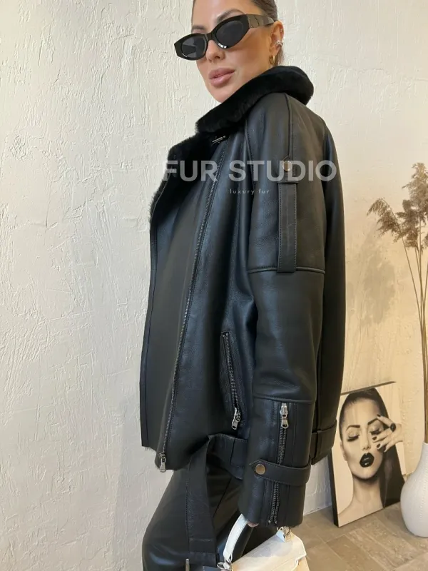 Дубленка авиатор в черном цвете из натуральной овчины 100371