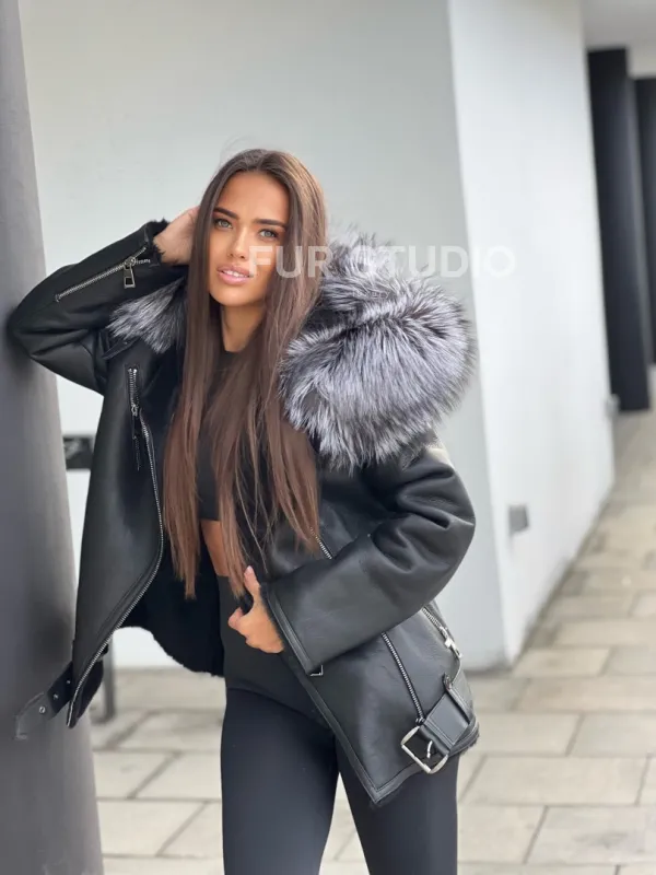Дубленка - косуха с капюшоном из меха чернобурой лисы 100299