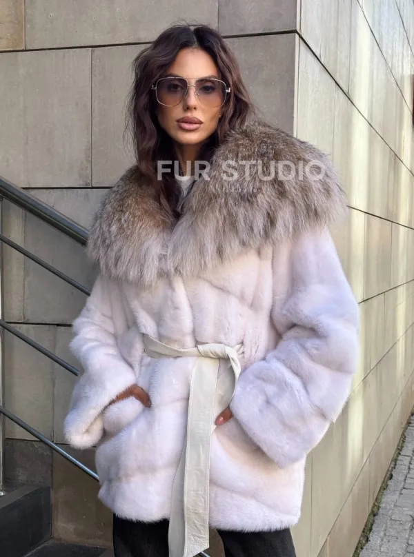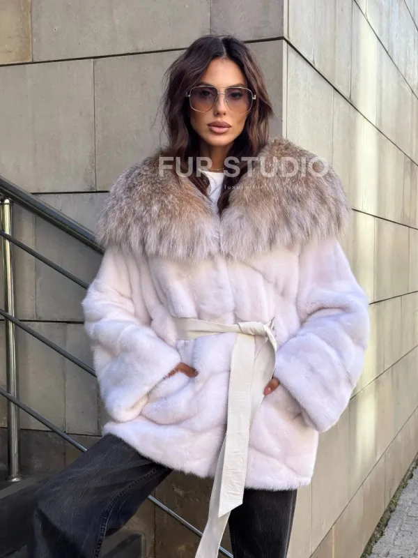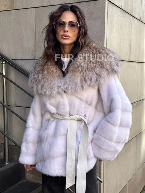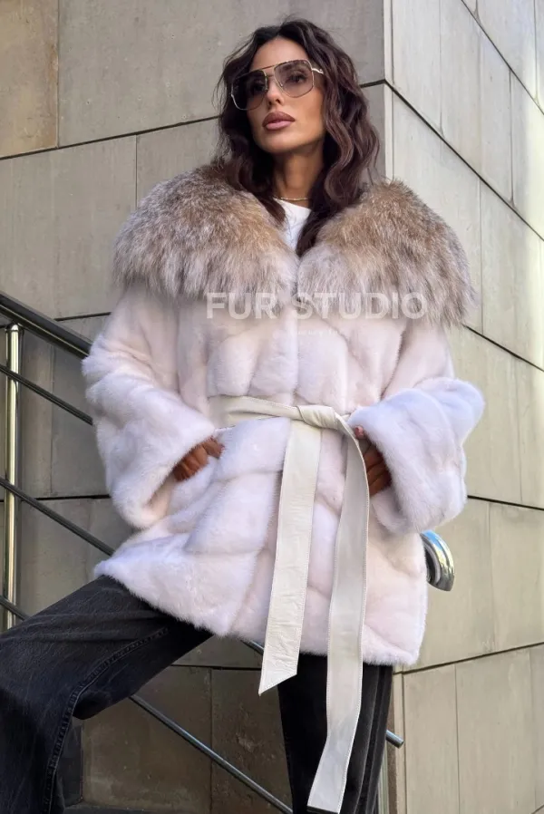 Норковая шуба с мехом рыси - белая 102107