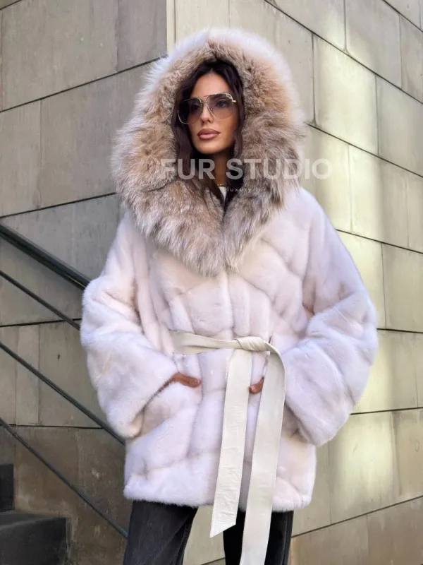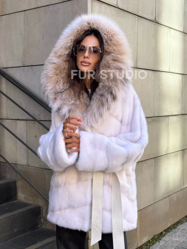 Шуба-пончо из меха норки с капюшоном из рыси – выбор утонченных дам с изысканным стилем. В модели вы будете выглядеть роскошно и женственно. Необычный крой подчеркивает достоинства фигуры. Оригинальный пояс очертит талию и визуально создает фигуру типа «песочные часы». Оптимальная длина удобна в носке и не сковывает движения.
