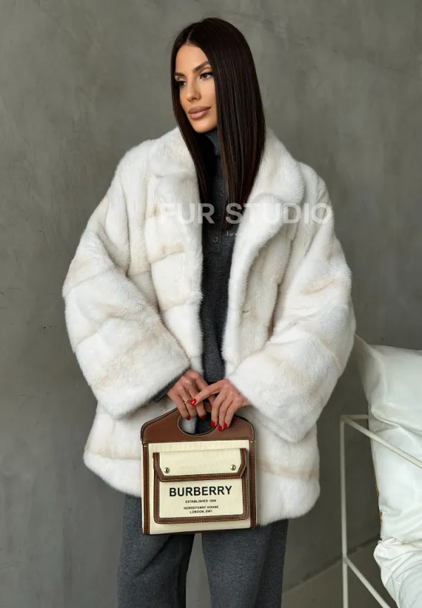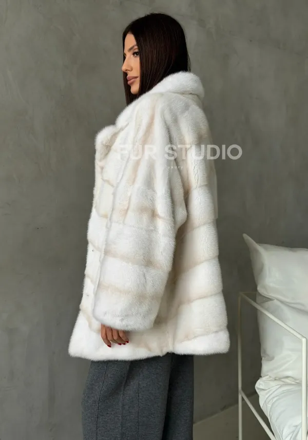 Мех данной шубы аукционная норка, цвет белый. Предлагается в размерах от 42 до 50. Длина модели 70-75 см, что выгодно подчеркивает фигуру девушек. Эта модель идеально подойдет для девушек и женщин, предпочитающих роскошные натуральные меха.